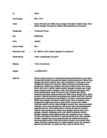 Olivya, Trisnawati (2011) Kasus Perseturuan Media Grup Dengan Sekretaris Kabinet Dipo Alam Dalam Bingkai Kompas dan Media Indonesia/Olivya Trisnawati. Skripsi thesis, UNIVERSITAS TARUMANAGARA.