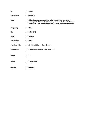 Vitia, Vitia (2011) Kajian kepuasan penghuni terhadap pengelolaan apartemen menengah di Jakarta, studi kasus: Apartemen Mediterania Palace Kemayoran - The Boutique Apartment - Apartemen Taman Rasuna. Masters thesis, UNIVERSITAS TARUMANAGARA.