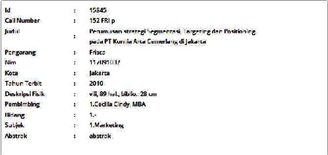 Frisca, Frisca (2010) Perumusan strategi Segmentasi, Targeting dan Positioning pada PT Kurnia Arta Cemerlang di Jakarta. Masters thesis, Universitas Tarumanagara.