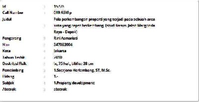 Asmariati, Rini (2010) Pola perkembangan properti yang terjadi pada sebuah area kota yang cepat berkembang, (studi kasus: Jalan Margonda Raya - Depok). Masters thesis, Universitas Tarumanagara.