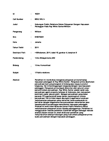 William, William (2011) Hubungan Public Relations Dalam Pelayanan Dengan Kepuasan Pelanggan Pada Ray White Sunter/William. Skripsi thesis, UNIVERSITAS TARUMANAGARA.