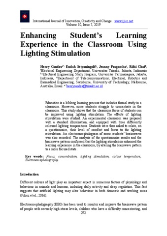Candra, Henry and Setyaningsih, Endah and Pragantha, Jeanny and Chai, Rifai Enhancing Student’s Learning Experience in the Classroom Using Lighting Stimulation. Enhancing Student’s Learning Experience in the Classroom Using Lighting Stimulation. ISSN 2201-1323