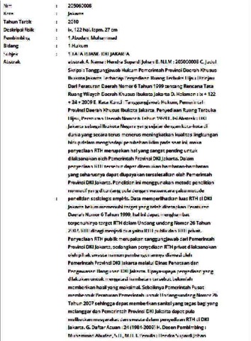 Supardi Johan, Hendra (2010) Tanggung jawab hukum pemerintah provinsi daerah khusus ibukota jakarta terhadap penyediaan ruang terbuka hijaua ditinjau dari Peraturan Daerah Nomor 6 Tahun 1999 tentang Rencana Tata Ruang Wilayah Daerah Khusus Ibukota Jakarta. Skripsi thesis, Universitas Tarumanagara.