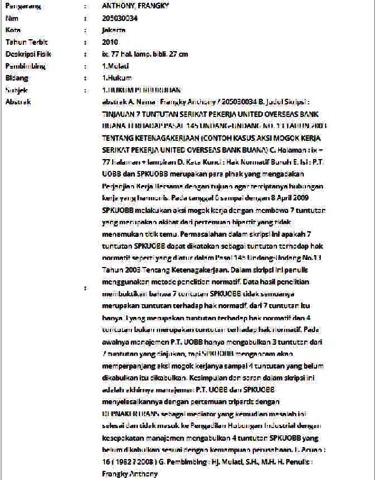 A. Nama : Frangky Anthony / 205030034 B. Judul Skripsi : TINJAUAN 7 TUNTUTAN SERIKAT PEKERJA UNITED OVERSEAS BANK BUANA TERHADAP PASAL 145 UNDANG-UNDANG NO. 13 TAHUN 2003 TENTANG KETENAGAKERJAAN (CONTOH KASUS AKSI MOGOK KERJA SERIKAT PEKERJA UNITED OVERSEAS BANK BUANA) C. Halaman : ix + 77 halaman + lampiran D. Kata Kunci : Hak Normatif Buruh E. Isi : P.T. UOBB dan SPKUOBB merupakan para pihak yang mengadakan Perjanjian Kerja Bersama dengan tujuan agar terciptanya hubungan kerja yang harmonis. Pada tanggal 6 sampai dengan 8 April 2009 SPKUOBB melakukan aksi mogok kerja dengan membawa 7 tuntutan yang merupakan akibat dari pertemuan bipartit yang tidak menemukan titik temu. Permasalahan dalam skripsi ini apakah 7 tuntutan SPKUOBB dapat dikatakan sebagai tuntutan terhadap hak normatif seperti yang diatur dalam Pasal 145 Undang-Undang No.13 Tahun 2003 Tentang Ketenagakerjaan. Dalam skripsi ini penulis menggunakan metode penelitian normatif. Data hasil penelitian membuktikan bahwa 7 tuntutan SPKUOBB tidak semuanya merupakan tuntutan terhadap hak normatif, dari 7 tuntutan itu hanya 3 yang merupakan tuntutan terhadap hak normatif dan 4 tuntutan bukan merupakan tuntutan terhadap hak normatif. Pada awalnya manajemen P.T. UOBB hanya mengabulkan 3 tuntutan dari 7 tuntutan yang diajukan, tapi SPKUOBB mengancam akan memperpanjang aksi mogok kerjanya sampai 4 tuntutan yang belum dikabulkan itu dikabulkan. Kesimpulan dan saran dalam skripsi ini adalah akhirnya manajemen P.T. UOBB dan SPKUOBB menyelesaikannya dengan pertemuan tripartit dengan DEPNAKERTRANS sebagai mediator yang kemudian masalah ini selesai dan tidak masuk ke Pengadilan Hubungan Industrial dengan kesepakatan manajemen mengabulkan 4 tuntutan SPKUOBB yang belum dikabulkan sesuai dengan kemampuan perusahaan. F. Acuan : 16 ( 1982 ? 2008 ) G. Pembimbing : Hj. Mulati, S.H., M.H. H. Penulis : Frangky Anthony