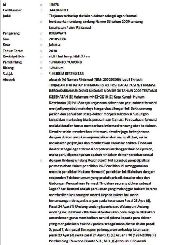 (A) Nama : Riniawati (NIM: 205050066) Judul Skripsi : TINJAUAN TERHADAP TINDAKAN DOKTER SEBAGAI ?AGEN? FARMASI BERDASARKAN UNDANG-UNDANG NOMOR 36 TAHUN 2009 TENTANG KESEHATAN (B) Halaman : vi+83+2010 (C) Kata Kunci : Hukum Kesehatan (D) Isi : Adanya kerjasama dokter dan perusahaan farmasi menjadi penyebab mahalnya harga obat dinegeri ini. Sakit seorang pasien dan penulisan resep dokter menjadi substansi hubungan kolusi dan marketing bisnis perusahaan farmasi. Perusahaan farmasi melalui detailer harus memberikan informasi tentang obat ke dokter. Detailer selain memberikan informasi, detailer juga bekerja sama dengan dokter untuk mempromosikan dan menjual obat, serta melakukan perjanjian dan memberikan bonus ke dokter. Tindakan dokter sebagai agen farmasi berpotensi melanggar hak-hak pasien, maka perlu dipertanyakan apakah tindakan dokter tersebut sesuai dengan Undang-undang Kesehatan?. Hal tersebut yang dijadikan permasalahan dalam penelitian ini. Penelitian ini menggunakan metode penelitian Hukum Normatif, penelitian ini dilakukan dengan responden 7 dokter umum yang praktik pribadi, detailer obat dan Gabungan Perusahaan Farmasi. Tindakan seorang dokter sebagai ?agen? dari farmasi adalah perbuatan yang melanggar hukum karena memberikan keuntungan materi kepada dokter hal mana bertentangan dengan larangan pada ketentuan Pasal 23 Ayat (4), Pasal 24 Ayat (1) Undang-undang kesehatan. Walaupun Undang-undang no 36 tahun 2009 baru diberlakukan perlu segera dilakukan amandemen guna memberikan sanksi pidana kepada para dokter yang mengabaikan hak-hak pasien sebagaimana diatur dalam pasal 5, pasal 7, dan pasal 8 maupun pelanggaran terhadap ketentuan pasal 23 Ayat (4) serta pasal 24 Ayat (1). (E) Acuan : 40 (1981-2009) (F) Pembimbing : Yuwono Prianto S.H., M.H., (G) Penulis : Riniawati