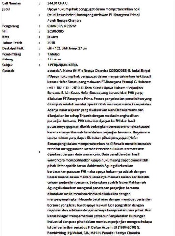 A. Nama (NIM) : Nessya Chandra (205060085) B. Judul Skripsi :?Upaya hukum pihak penggugat dalam mempertahankan hak (studi kasus : Hefer Simatupang melawan PT.Rotaryana Prima)? C. Halaman : viii + 102 + 30 + 2010. D. Kata Kunci : Upaya Hukum ; Perjanjian Bersama E. Isi : Kasus Hefer Simatupang berawal dari PHK yang dilakukan PT.Rotaryana Prima. Proses penyelesaian perselisihan yang ditempuh setelah melalui Bipartit tidak mencapai suatu kesepakatan. Adanya surat anjuran yang dikeluarkan oleh Disnakertrans dan dilanjutkan ke tahap Tripartit dengan mediasi menghasilkan perjanjian bersama. PHK tersebut digugat ke PHI dan hasil putusannya gugatan ditolak sedangkan penetapan noneksekutabel karena adanya klausula batal dalam perjanjian bersama. Bagaimana upaya hukum yang dapat dilakukan pihak penggugat (Hefer Simatupang) dalam mempertahankan hak? Penulis meneliti masalah tersebut menggunakan Metode Penelitian Hukum normatif dan diperkuat dengan data wawancara. Data penelitian dan hasil wawancara memperlihatkan upaya hukum yang dapat diambil oleh pihak Hefer apabila fatwa Mahkamah Agung dikeluarkan berdasarkan putusan PHI maka upaya hukumnya adalah dengan kasasi dimana dalam memori kasasinya memuat alasan dari ketidak tahuan perjanjian bersama. Sedangkan apabila fatwa Mahkamah Agung dikeluarkan mengenai penetapan perjanjian bersama dibatalkan maka meminta eksekusi dikabulkan dengan mengenyampingkan klausula batal atau dengan membuat perjanjian bersama yang baru lewat upaya hukum luar pengadilan dengan negosiasi dan arbitrase dengan adanya kesepakatan para pihak. Dari kasus ini agar memperhatikan prosedur Penyelesaian Hubungan Industrial dan para pihak dalam membuat perjanjian mengetahui apa isi dari perjanjian tersebut. F. Daftar Acuan : 30 (1984-2010) G. Pembimbing : Hj.Mulati, S.H., M.H. H. Penulis : Nessya Chandra