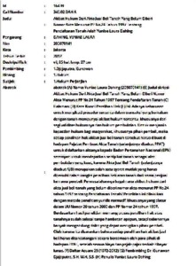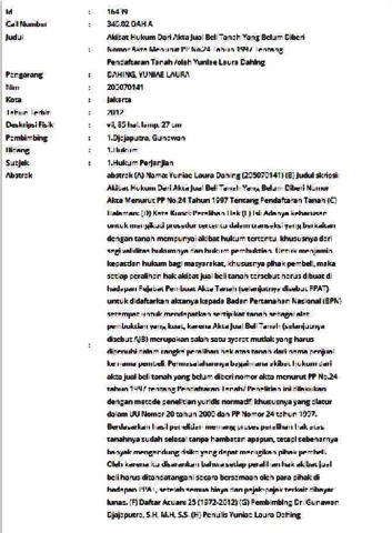 (A) Nama: Yuniae Laura Dahing (205070141) (B) Judul skripsi: Akibat Hukum Dari Akta Jual Beli Tanah Yang Belum Diberi Nomor Akta Menurut PP No.24 Tahun 1997 Tentang Pendaftaran Tanah (C) Halaman: (D) Kata Kunci: Peralihan Hak (E) Isi: Adanya keharusan untuk mengikuti prosedur tertentu dalam transaksi yang berkaitan dengan tanah mempunyai akibat hukum tertentu, khususnya dari segi validitas hukumnya dan hukum pembuktian. Untuk menjamin kepastian hukum bagi masyarakat, khususnya pihak pembeli, maka setiap peralihan hak akibat jual beli tanah tersebut harus dibuat di hadapan Pejabat Pembuat Akta Tanah (selanjutnya disebut PPAT) untuk didaftarkan aktanya kepada Badan Pertanahan Nasional (BPN) setempat untuk mendapatkan sertipikat tanah sebagai alat pembuktian yang kuat, karena Akta Jual Beli Tanah (selanjutnya disebut AJB) merupakan salah satu syarat mutlak yang harus dipenuhi dalam rangka peralihan hak atas tanah dari nama penjual ke nama pembeli. Permasalahannya bagaimana akibat hukum dari akta jual beli tanah yang belum diberi nomor akta menurut PP No.24 tahun 1997 tentang Pendaftaran Tanah? Penelitian ini dilakukan dengan metode penelitian yuridis normatif, khususnya yang diatur dalam UU Nomor 20 tahun 2000 dan PP Nomor 24 tahun 1997. Berdasarkan hasil penelitian memang proses peralihan hak atas tanahnya sudah selesai tanpa hambatan apapun, tetapi sebenarnya banyak mengandung risiko yang dapat merugikan pihak pembeli. Oleh karena itu disarankan bahwa setiap peralihan hak akibat jual beli harus ditandatangani secara bersamaan oleh para pihak di hadapan PPAT, setelah semua biaya dan pajak-pajak terkait dibayar lunas. (F) Daftar Acuan: 25 (1972-2012) (G) Pembimbing Dr. Gunawan Djajaputra, S.H, M.H, S.S. (H) Penulis Yuniae Laura Dahing
