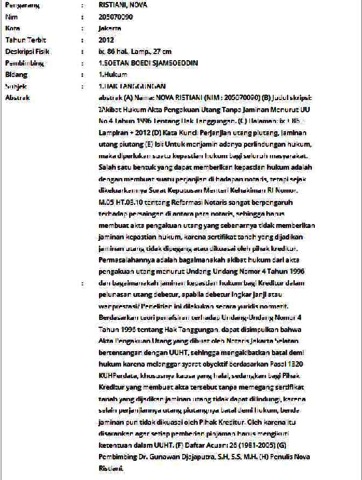 Ristiani, Nova (2012) Akibat Hukum Akta Pengakuan Utang Tanpa Jaminan Menurut UU No 4 Tahun 1996 Tentang Hak Tanggungan. Skripsi thesis, Universitas Tarumanagara.