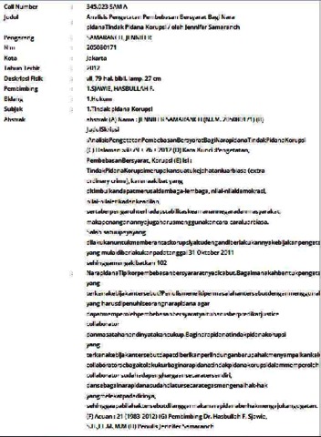 (A) Nama : JENNIFER SAMARANCH (N.I.M. 205080171) (B)Judul Skripsi: Analisis Pengetatan Pembebasan Bersyarat Bagi Narapidana Tindak Pidana Korupsi (C) Halaman :vii+79 + 76 + 2012 (D) Kata Kunci :Pengetatan, Pembebasan Bersyarat, Korupsi (E) Isi : Tindak Pidana Korupsi merupakan suatu kejahatan luar biasa (extra ordinary crime), karena akibat yang ditimbulkan dapat merusak lembaga-lembaga, nilai-nilai demokrasi, nilai-nilai etika dan keadilan, serta berpengaruh terhadap stabilitas keamanan negara dan masyarakat, maka penanganannya juga harus menggunakan cara-cara luarbiasa. Salah satu upaya yang dilakukan untuk memberantas korupsi yaitu dengan diberlakukannya kebijakan pengetatan pembebasan bersyarat yang mulai diberlakukan pada tanggal 31 Oktober 2011 sehingga mengakibatkan 102 Narapidana Tipikor pembebasan bersyararatnya dicabut. Bagaimanakah bentuk pengetatan pembebasan bersyarat dan bagaimanakah bentuk perlindungan terhadap narapidana tindak pidana korupsi yang terkena kebijakan tersebut? Penulis meneliti permasalahan tersebut dengan menggunakan metode penelitian hukum normatif.Bentuk pengetatan pembebasan bersyarat yaitu dengan ditambahkannya persyaratan yang harus dipenuhi seorang narapidana agar dapat memperoleh pembebasan bersyaratya itu harus berpredikat justice collaborator dan masa tahanan dinyatakan cukup.Bagi narapidana tindak pidana korupsi yang terkena kebijakan tersebut dapat diberikan perlindungan berupa hak menyampaikan keluhan dalam artian bisa mengajukan gugatan karena haknya dilanggar.Dengan dijadikannya justice collaborator sebagai tolak ukur bagi narapidana tindak pidana korupsi dalam memperoleh pembebasan bersyarat dirasakan kurang tepat karena sebagai justice collaborator sudah ada penghargaan secara tersendiri, dan sebagai narapidana sudah diatur secara tegas mengenai hak-hak yang melekat pada dirinya, sehingga apabila hak tersebut dilanggar maka narapidana berhak mengajukan gugatan. (F)Acuan : 21 (1983-2012) (G) Pembimbing Dr. Hasbullah F. Sjawie, S.H.,LL.M.,M.M (H) Penulis Jennifer Samaranch