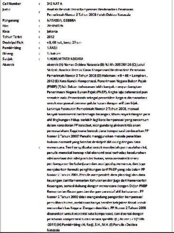 (A) Nama : Debbra Natassia (B) N.I.M : 205050126 (C) Judul Skripsi : Analisis Bentuk Dana Kompensasi Berdasarkan Peraturan Pemerintah Nomor 2 Tahun 2008 (D) Halaman : viii + 68 + Lampiran , 2012 (E) Kata Kunci : Kompensasi, Penerimaan Negara Bukan Pajak (PNBP) (F) Isi : Sektor kehutanan lebih banyak menyumbangkan Penerimaan Negara Bukan Pajak (PNBP). Angka laju deforestasi pun semakin naik. Pemerintah sebagai perwakilan Negara diamanatkan untuk menguasai dan mengelola hutan dengan arif dan bijak. Lahirnya Peraturan Pemerintah Nomor 2 Tahun 2008, menuai banyak kontroversi dari berbagai kalangan, khususnya kalangan para ahli lingkungan hidup, terlebih lagi kata kompensasi yang tercantum dalam konsideran PP tersebut, mengundang pikiran kritis akan permasalahan: Bagaimana bentuk dana kompensasi berdasarkan PP Nomor 2 Tahun 2008? Penulis menggunakan metode penelitian hukum normatif yang bersifat deskriptif didukung dengan data wawancara. Teori yang dipakai untuk membedah permasalahan ini, penulis memakai konsep nilai ekonomi total terhadap keseluruhan nilai manfaat dan nilai produksi hutan, serta memakai konsep pembangunan berkelanjutan dan teori good governance, dan juga menjabarkan formula penghitungan tarif PNBP yang ada dalam PP Nomor 2 Tahun 2008. Penulis memperoleh data planologi dan data keuangan dari Kementerian Kehutanan dan juga dari Kementerian Keuangan, serta didukung dengan wawancara dengan DirJen PNBP Kementerian Keuangan dan dengan para staf ahli kehutanan. PP Nomor 2 Tahun 2008 tidak mengandung pengertian kompensasi pemulihan hutan, melainkan hanya bersifat kebijakan fiskal untuk menambah kas Negara. Dengan demikian, PP Nomor 2 Tahun 2008 disarankan untuk merevisi kata kompensasi, dan disertai dengan peraturan kompensasi hutan secara spesifik. (G) Acuan : 23 (1986 -2011) (H) Pembimbing : H. Rasji, S.H., M.H. (I) Penulis : Debbra Natassia