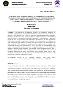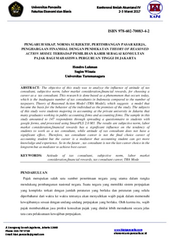 Lukman, Hendro and Winata, Sugim Pengaruh sikap, norma subjektif, pertimbangan pasar kerja, penghargaan finansial dengan pendekatan theory of reasoned action model terhadap pemilihan karir sebagai konsultan pajak bagi mahasiswa perguruan tinggi di jakarta. Karya Ilmiah Dosen. ISSN 978-602-70083-4-2