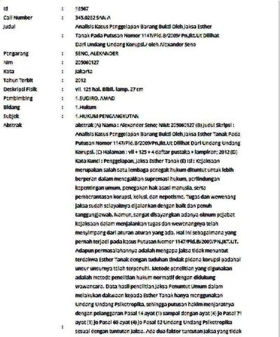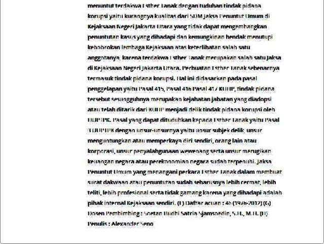 (A) Nama : Alexander Seno; NIM: 205060127 (B) Judul Skripsi : Analisis Kasus Penggelapan Barang Bukti Oleh Jaksa Esther Tanak Pada Putusan Nomor 1147/Pid.B/2009/Pn.Jkt.Ut Dilihat Dari Undang-Undang Korupsi. (C) Halaman : vii + 125 + 4 daftar pustaka + lampiran; 2012 (D) Kata Kunci : Penggelapan, Jaksa Esther Tanak (E) Isi : Kejaksaan merupakan salah satu lembaga penegak hukum dituntut untuk lebih berperan dalam menegakkan supremasi hukum, perlindungan kepentingan umum, penegakan hak asasi manusia, serta pemberantasan korupsi, kolusi, dan nepotisme. Tugas dan wewenang jaksa sudah selayaknya dijalankan dengan baik dan penuh tanggungjawab. Namun, sangat disayangkan adanya oknum pejabat kejaksaan dalam menjalankan tugas dan wewenangnya telah menyimpang dari aturan-aturan yang ada. Hal ini sebagaimana yang pernah terjadi pada kasus Putusan Nomor 1147/Pid.B/2009/PN.JKT.UT. Adapun permasalahannya adalah mengapa jaksa tidak menuntut terdakwa Esther Tanak dengan tuduhan tindak pidana korupsi padahal unsur-unsurnya telah terpenuhi. Metode penelitian yang digunakan adalah metode penelitian hukum normatif dengan didukung wawancara. Data hasil penelitian Jaksa Penuntut Umum dalam melakukan dakwaan kepada Esther Tanak hanya menggunakan Undang-Undang Psikotropika, sehingga putusan hakim menjaratnya dengan pelanggaran Pasal 14 ayat (1) sampai dengan ayat (4) jo Pasal 71 ayat (1) jo Pasal 60 ayat (4) jo Pasal 62 Undang-Undang Psikotropika sesuai dengan tuntutan Jaksa. Ada dua faktor tuntutan Jaksa yang tidak menuntut terdakwa Esther Tanak dengan tuduhan tindak pidana korupsi yaitu kurangnya kualitas dari SDM Jaksa Penuntut Umum di Kejaksaan Negeri Jakarta Utara yang tidak dapat mengembangkan penuntutan kasus yang dihadapi dan kemungkinan hendak menutupi kebobrokan lembaga Kejaksaan atas keterlibatan salah satu anggotanya, karena terdakwa Esther Tanak merupakan salah satu Jaksa di Kejaksaan Negeri Jakarta Utara. Perbuatan Esther Tanak sebenarnya termasuk tindak pidana korupsi. Hal ini didasarkan pada pasal penggelapan yaitu Pasal 415, Pasal 416 Pasal 417 KUHP, tindak pidana tersebut sesungguhnya merupakan kejahatan jabatan yang diadopsi atau telah ditarik dari KUHP menjadi delik tindak pidana korupsi oleh UUPTPK. Pasal yang dapat dituduhkan kepada Esther Tanak yaitu Pasal 3 UUPTPK dengan unsur-unsurnya yaitu unsur subjek delik, unsur menguntungkan atau memperkaya diri sendiri, orang lain atau korporasi, unsur penyalahgunaan wewenang serta unsur merugikan keuangan negara atau perekonomian negara sudah terpenuhi. Jaksa Penuntut Umum yang menangani perkara Esther Tanak dalam membuat surat dakwaan atau penuntutan sudah seharusnya lebih cermat, lebih teliti, lebih profesional serta tidak gamang karena yang dihadapi adalah pihak internal Kejaksaan sendiri. (F) Daftar acuan : 46 (1976-2012) (G) Dosen Pembimbing : Soetan Budhi Satria Sjamsoedin, S.H., M.H. (H) Penulis : Alexander Seno