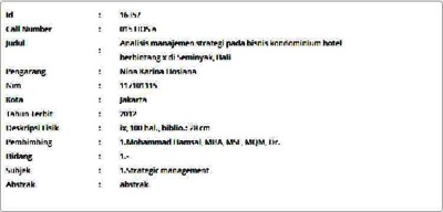 Hosiana, Nina Karina (2012) Analisis manajemen strategi pada bisnis kondominium hotel berbintang x di Seminyak, Bali. Masters thesis, Universitas Tarumanagara.
