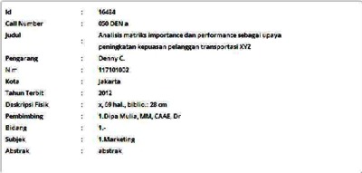 C, Denny (2012) Analisis matriks importance dan performance sebagai upaya peningkatan kepuasan pelanggan transportasi XYZ. Masters thesis, Universitas Tarumanagara.