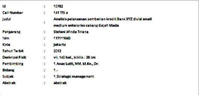Triana, Stefani Winda (2012) Analisis pelaksanan pemberian kredit Bank XYZ divisi small medium enterprise cabang Gajah Mada. Masters thesis, Universitas Tarumanagara.