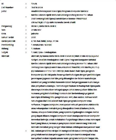 Vitalli, Raisenda Derek (2012) Analisis Pembajakan Hak Cipta Program Komputer Melalui Media Cakram Optik Menurut Undang-Undang Nomor 19 Tahun 2002 Tentang Hak Cipta (Contoh Kasus Nomor: 1944/PID.B/2006/PN.JKT.PST). Skripsi thesis, Universitas Tarumanagara.