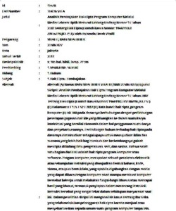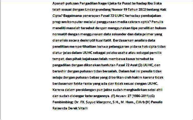 (A) Nama: RAISENDA DEREK VITALLI (NIM: 205060027) (B) Judul Skripsi: Analisis Pembajakan Hak Cipta Program Komputer Melalui Media Cakram Optik Menurut Undang-Undang Nomor 19 Tahun 2002 Tentang Hak Cipta (Contoh Kasus Nomor: 1944/PID.B/2006/PN.JKT.PST) (C) Halaman: x + 105 + 52 + 2012 (D) Kata kunci: hak cipta, program komputer (E) Isi: HKI pada dasarnya berhubungan dengan perlindungan penerapan gagasan dan ide yang dituangkan ke dalam suatu karya intelektual yang bernilai ekonomis dalam hal penggunaan suatu karya dan penyebarluasannya. Perlindungan hukum terhadap hak cipta pada dasarnya dimaksudkan sebagai upaya untuk mewujudkan iklim dan suasana yang lebih baik bagi tumbuh dan berkembangnya gairah mencipta di bidang ilmu pengetahuan, seni, dan sastra. Bahwa salah satu bagian dari HKI adalah hak cipta program komputer atau software. Progam komputer, merupakan sebuah peralatan elektronik atau sekumpulan instruksi yang diwujudkan bentuk bahasa, kode, skema, ataupun bentuk lain, yang apabila digabungkan dengan media yang dapat dibaca dengan komputer akan mampu membuat komputer terssebut bekerja untuk melakukan fungsi-fungsi khusus atau mencapai hasil yang khusus, termasuk penyiapan dalam merancang instruksi-instruksi tersebut yang sangat lekat dalam kehidupan masyarakat saat ini. Dalam penelitian skripsi ini menganalisis kasus Tentang Ibu Siska yang telah melakukan pelanggaran hak cipta karena menjual atau menyebarluaskan kepada umum suatu program komputer tanpa izin. Apakah putusan Pengadilan Negeri Jakarta Pusat terhadap Ibu Siska telah sesuai dengan Undang-undang Nomor 19 Tahun 2002 tentang Hak Cipta? Bagaimana penerapan Pasal 72 UUHC terhadap pembajakan program komputer melalui penggunaan media cakram optik? Penulis meneliti masalah tersebut dengan menggunakan tipe penelitian hukum normatif dengan menggunakan data sekunder dan data primer yang dianalisis secara deskriptif kualitatif. Berdasarkan analisis data penelitian memperlihatkan bahwa pelanggaran pidana hak cipta tidak diatur jelas dalam UUHC sebagai pelaku usaha atau sebagai pemilik tempat, dan pihak kejaksaan telah membawa kasus tersebut ke pengadilan dengan dikenakan tuntutan Pasal 72 Ayat (2) UUHC, dan berakhir dengan putusan tidak bersalah. Dalam hal ini penulis tidak setuju dengan putusan bebas yang diberikan oleh hakim karena tidak berdasarkan fakta-fakta yang ada dan tidak sesuai dengan UUHC. Karena dalam persidangan pun jaksa sudah menghadirkan saksi ahli dan sudah didengar keterangannya. (F) Acuan: 27 (1986-2011) (G) Pembimbing: Dr. FX. Suyud Margono, S.H., M. Hum., CIArb (H) Penulis Raisenda Derek Vitalli