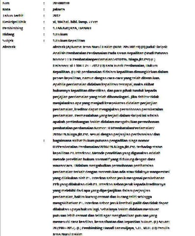 (A) Nama: Irma Nurul Hakim (NIM: 205080159) (B) Judul Skripsi: Analisis Pembatalan Perdamaian Pada Kasus Kepailitan (Studi Putusan Nomor : 03/ Pembatalanperdamaian/2010/Pn. Niaga.Jkt.Pst) (C) Halaman: xi + 104 + 28 + 2012 (D) Kata kunci: Perdamaian, Hukum Kepailitan. (E) Isi: perdamaian didalam kepailitan dimungkinkan dalam proses kepailitan, namun dengan cara-cara yang telah ditentukan. Apabila perdamaian didalam kepailitan tercapai, maka akibat hukumnya kepailitan dihentikan, dan para pihak tunduk kepada perjajian perdamaian yang telah dihomologasi. Jika debitor tidak menjalankan apa yang menjadi kesepakatan didalam perjanjian perdamaian, kreditor dapat mengajukan permohonan permbatalan perdamaian. Permasalahan yang terjadi dalam skripsi ini adalah apakah pertimbangan hakim didalam mengabulkan permohonan pembatalan perdamaian Nomor : 03/PembatalanPerdamaian/ 2010/PN.Niaga.Jkt.Pst. sesuai dengan perjanjian perdamaian? dan bagaimana akibat hukum putusan pengadilan niaga nomor 03/Pembatalan Perdamaian/2010/PN.Niaga.Jkt.Pst. terhadap status kepailitan PT.Interkon?. Metode penelitian yang digunakan adalah metode penelitian hukum normatif yang didukung dengan data wawancara. Didalam mengabulkan permohonan pembatalan perdamaian terkait dengan menentukan ada atau tidaknya wanprestasi yang dilakukan oleh PT. Interkon Kebon Jeruk mengenai pembebanan PPh yang dilakukan oleh PT. Interkon Kebon Jeruk kepada kreditornya yang melebihi dari apa yang diperjanjikan dalam perjanjian perdamaian, hakim kurang cermat dan kurang teliti sehingga mengakibatkan PT. Interkon Kebon Jeruk kembali pailit dan tidak dapat dilakukan upaya hukum lagi. Sebaiknya hakim didalam membuat putusan lebih cermat dan teliti agar menghasilkan putusan yang memenuhi rasa keadilan, kemanfaatan dan kepastian hukum. (F) Acuan: 28 (1988-2012). (G) Pembimbing Hanafi Tanawijaya, S.H., M.H. (H) Penulis Irma Nurul Hakim