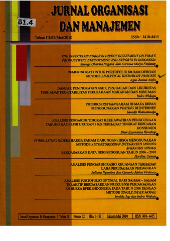 An optimum portfolio must be built from individual stocks that have good performance and do not correlated positively each other. Therefore, a portfolio built only from one industri must be avoided. The stock coming from one industri must be selected to one individual stock, which is the best in such industri. The problem of this research is how to rank those stocks in one industri and to select one individual stock that has best performance. The aim of this research as to analysize whether the Analytical Hierarchy Process combined with financial rasio criteria can be used to determine the stock rank in coal-mining mdustri. This research result that the Analytical Hierarchy Process cannot be used to rank those particular stocks due to inconsistent financial ratio criteria used.