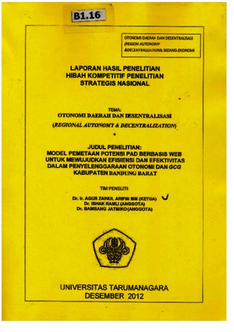 UNSPECIFIED and Ramli, Ishak and Djatmiko, Bambang (2012) Model pemetaan potensi pad berbasis web untuk mewujudkan efisiensi dan efektivitas dalam penyelenggaraan otonomi dan gcg kabupaten bandung barat. LPPI.