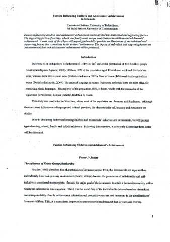 Setiono, Kusdwiratri and Tiatri, Sri (2009) Factors Influencing Students' Adolescents' Achievement in Indonesia. In: The Conference of Excellent Asia. (Unpublished)