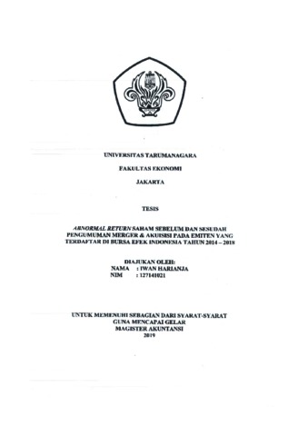 Harianja, Iwan (2019) Abnormal return saham sebelum dan sesudah pengumuman merger dan akuisisi pada emiten yang terdaftar di Bursa Efek Indonesia tahun 2014-2018. Masters thesis, Universitas Tarumanagara.