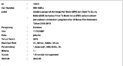 Hartono, Hartono (2012) Analisis pengaruh Earnings Per Share (EPS) dan Debt To Equity Ratio (DER) terhadap Price To Book Value (PBV) saham-saham perusahaan perbankan yang terdaftar di Bursa Efek Indonesia Tahun 2006-2010. Masters thesis, Universitas Tarumanagara.