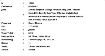 Dharma, Shirley (2012) Analisis pengaruh Earnings Per Share (EPS), Debt To Equity Ratio (DER), Price To Book Value (PBV) dan tingkat inflasi terhadap return saham pertambangan yang terdaftar di Bursa Efek Indonesia Tahun 2007-2010. Masters thesis, Universitas Tarumanagara.