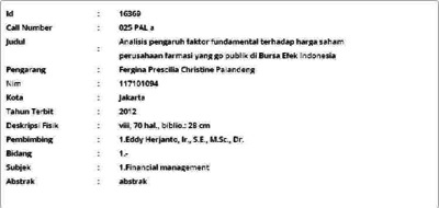 Palandeng, Fergina Prescilia Christine (2012) Analisis pengaruh faktor fundamental terhadap harga saham perusahaan farmasi yang go publik di Bursa Efek Indonesia. Masters thesis, Universitas Tarumanagara.