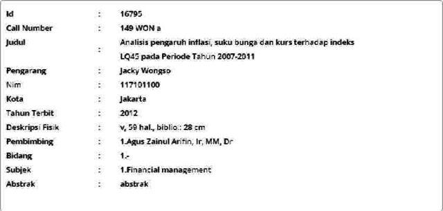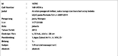 Wongso, Jacky (2012) Analisis pengaruh inflasi, suku bunga dan kurs terhadap indeks LQ45 pada Periode Tahun 2007-2011. Masters thesis, Universitas Tarumanagara.