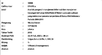 Steven, Nicolas (2012) Analisis pengaruh manajemen informasi dan manajemen keuangan terhadap Initial Rate of Return pada perusahaan yang melakukan penawaran perdana di Bursa Efek Indonesia Periode 2004-2011. Masters thesis, Universitas Tarumanagara.