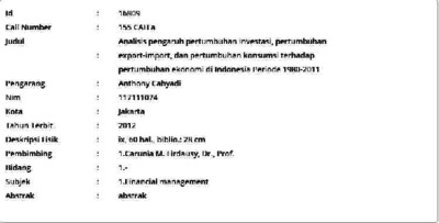 Cahyadi, Anthony (2012) Analisis pengaruh pertumbuhan investasi, pertumbuhan export-import, dan pertumbuhan konsumsi terhadap pertumbuhan ekonomi di Indonesia Periode 1980-2011. Masters thesis, Universitas Tarumanagara.