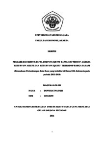Ratnasari, Dewi (2016) PENGARUH CURRENT RATIO, DEBT TO EQUITY RATIO, NET PROFIT MARGIN , RETURN ON ASSETS DAN RETURN ON EQUITY TERHADAP HARGA SAHAM (Perusahaan Pertambangan Batu Bara yang terdaftar di Bursa Efek Indonesia pada periode 2011-2014). Skripsi thesis, Universitas Tarumanagara.
