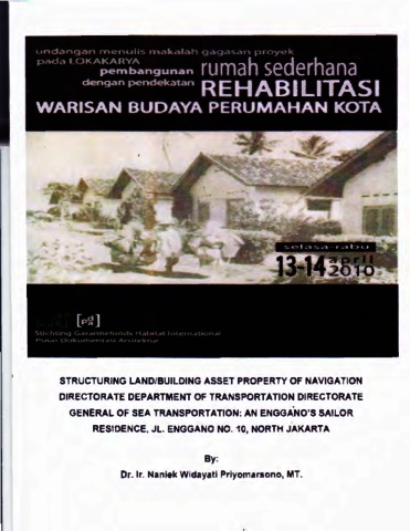 Priyomarsono, Naniek Widayati (2010) STRUCTURING LAND/BUILDING ASSET PROPERTY OF NAVIGATION DIRECTORATE DEPARTMENT OF TRANSPORTATION DIRECTORATE GENERAL OF SEA TRANSPORTATION: AN ENGGANO’S SAILOR RESIDENCE, JL. ENGGANO NO. 10, NORTH JAKARTA. Lokakarya Pembangunan Rumah Sederhana dengan Pendekatan Rehabilitasi Warisan Budaya Perumahan Kota.