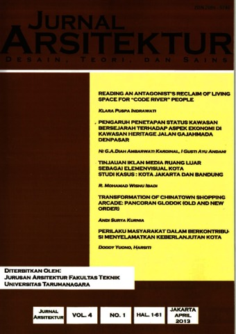 Jakarta as the capital of the State which was once the center of government, now posseses a particular charm of its own, uncomparable to other major cities in the world. Located beside Jakarta Old Town - the main attraction in the Capital Region of Jakarta is Jakarta Old Town -, Chinatown foreshadowed one corner of the old district of Jakarta, which is better known as Glodok. Glodok is known as a trading center offering variety of daily needs, uniquely displayed through the use of frontage of the shops along the Pancoran street. Shopping-arcade is a familiar name that can explain the phenomenon happening in the region Pancoran Glodok. Its existence became the starting point of research, because Chinatown was the target of mass amok of the riots in May 1998. Still in the memory of urban (read: city) are burning,, destruction, and looting going on there. However the region remains as an economic center until now. How the situation that characterizes the development of the region from time to time, especially during the Old Order and New Order government after the independence day (post-colonial), becomes the output to achieve in this study. In effort to see the development of existing urban memory becomes the focus, so that later studies using intrepretative-historical method in exploring narrative attached to the region. Preparation of the narrative is also supported by computational simulation in order to provide an illustration representing completeness of its time, which may not be obtained at the time of data collection. So at the end of this article, the reader should be able to obtain whole discussion of the intrepretative narrative, to enrich the knowledge of the existence of the shopping arcade in the old and new order.