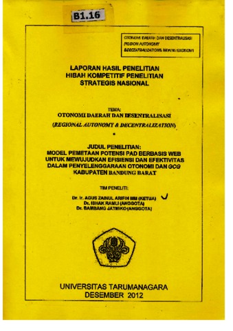 Arifin, Agus Zainul and Ramli, Ishak and Jatmiko, Bambang (2012) Model pemetaan potensi pad berbasis web untuk mewujudkan efisiensi dan efektivitas dalam penyelenggaraan otonomi dan gcg kabupaten bandung barat. Laporan Hasil Penelitian Hibah Kompetitif Penelitian Strategis Nasional.