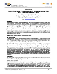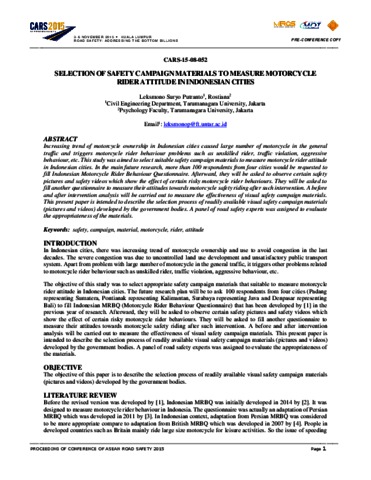 Putranto, Leksmono Suryo and Rostiana, Rostiana (2015) SELECTION OF SAFETY CAMPAIGN MATERIALS TO MEASURE MOTORCYCLE RIDER ATTITUDE IN INDONESIAN CITIES. In: Conference of ASEAN Road Safety, 3-6 November 2015, Kuala Lumpur.