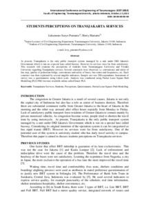 Putranto, Leksmono Suryo and Hartarto, Herry (2013) STUDENTS PERCEPTIONS ON TRANSJAKARTA SERVICES. In: International Conference on Engineering of Tarumanagara (ICET 2013), 2-3 Oktober 2013, Tarumanagara University, Jakarta.