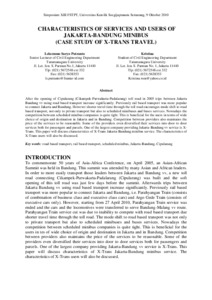 After the opening of Cipularang (Cikampek-Purwakarta-Padalarang) toll road in 2005 trips between Jakarta Bandung vv using road based transport increase significantly. Previously rail based transport was more popular to connect Jakarta and Bandung. However shorter travel time through the toll road encourages mode shift to road based transport, not only to private transport but also to scheduled minibuses and buses services. Nowadays the competition between scheduled minibus companies is quite tight. This is beneficial for the users in terms of wide choice of origin and destination in Jakarta and in Bandung. Competition between providers also maintains the price of the services to be reasonable. Some of the providers even diversified their services into door to door services both for passengers and parcels. One of the largest company providing Jakarta-Bandung vv service is X-Trans. This paper will discuss characteristics of X-Trans Jakarta-Bandung minibus service. The characteristics of X-Trans users will also be discussed.