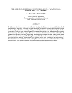 Putranto, Leksmono Suryo and Maulana, R (2010) THE OPERATIONAL PERFORMANCE OF SCHOOL BUS IN A PRIVATE SCHOOL IN DEPOK, WEST JAVA, INDONESIA. In: The 15th Hong Kong Society for Transport Studies International Conference., Hong Kong.