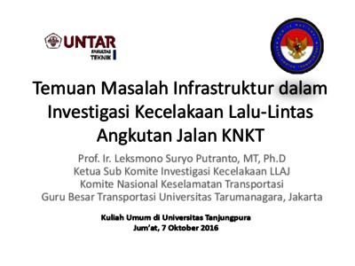 Putranto, Leksmono Suryo (2016) Temuan Masalah Infrastruktur dalam Investigasi Kecelakaan Lalu-Lintas Angkutan Jalan KNKT. In: pada Kuliah Tamu di Jurusan Teknik Sipil Universitas Tanjungpura, 7 Oktober 2016, Pontianak.