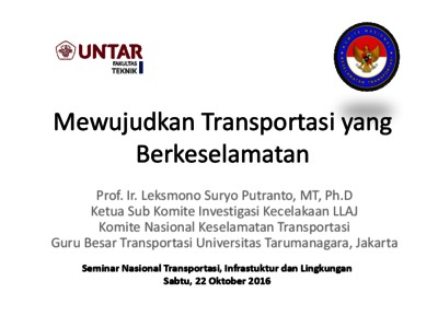 Putranto, Leksmono Suryo (2016) Mewujudkan Transportasi yang Berkeselamatan. In: Seminar Infrasturktur dan Transportasi Universitas Hasanuddin, 22 Oktober 2016, Makassar.