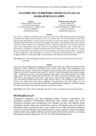 Elviany, Elviany and Putranto, Leksmono Suryo (2015) ANALISIS MULTI KRITERIA PENDANAAN JALAN DAERAH DENGAN APBN. In: The 18th FSTPT International Symposium, Unila, Bandar Lampung, 28 Agustus 2015, Lampung.