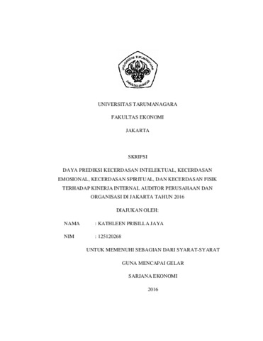 Prisilla Jaya, Kathleen (2016) Daya prediksi kecerdasan intelektual, kecerdasan emosional, kecerdasan spiritual, dan kecerdasan fisik terhadap kinerja internal auditor perusahaan dan organisasi di jakarta tahun 2016. / Kathleen Prisilla Jaya. Skripsi thesis, Universitas Tarumanegara.