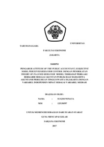 Winata, Sugim (2017) Pengaruh attitude of the public accountant, subjective norm, perceived behavior control dengan pendekatan theory of planned behavior model terhadap pemilihan karir sebagai akuntan publik bagi mahasiswa akuntansi perguruan tinggi swasta di Jakarta dengan variabel independen minat sebagai variabel me / Sugim Winata. Skripsi thesis, Universitas Tarumanagara.