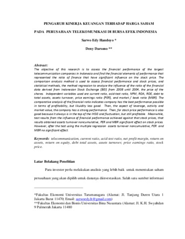 Handoyo, Sarwo Edy and Darsono, Deny (2011) PENGARUH KINERJA KEUANGAN TERHADAP HARGA SAHAM PADA PERUSAHAAN TELEKOMUNIKASI DI BURSA EFEK INDONESIA. Karya Ilmiah Dosen.