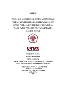Rosalina, Rosalina (2017) Pengaruh modernisasi sistem administrasi perpajakan, pengetahuan perpajakan, dan sanksi perpajakan terhadap kepatuhan wajib pajak pada KPP Pratama Jakarta Gambir Empat / Rosalina. Skripsi thesis, UNIVERSITAS TARUMANEGARA.