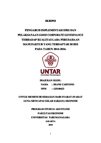 Cahyono, Diane (2018) PENGARUH IMPLEMENTASI IFRS DAN PELAKSANAANGOOD CORPORATE GOVERNANCE TERHADAP KUALITAS LABA PERUSAHAAN MANUFAKTUR YANG TERDAFTAR DI BEI PADA TAHUN 2014-2016. Skripsi thesis, Universitas Tarumanagara.