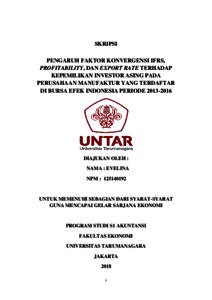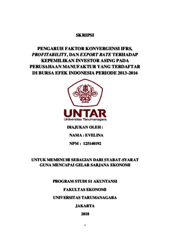 Evelina, Evelina (2018) PENGARUH FAKTOR KONVERGENSI IFRS, PROFITABILITY, DAN EXPORT RATE TERHADAP KEPEMILIKAN INVESTOR ASING PADA PERUSAHAAN MANUFAKTUR YANG TERDAFTAR DI BURSA EFEK INDONESIA PERIODE 2013-2016. Skripsi thesis, Universitas Tarumanagara.