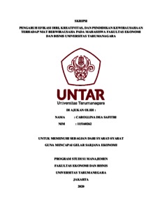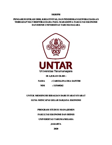 SAFITRI, CAROLLINA DEA (2021) PENGARUH EFIKASI DIRI, KREATIVITAS, DAN PENDIDIKAN KEWIRAUSAHAAN TERHADAP NIAT BERWIRAUSAHA PADA MAHASISWA FAKULTAS EKONOMI DAN BISNIS UNIVERSITAS TARUMANAGARA. Skripsi thesis, Universitas Tarumanagara.